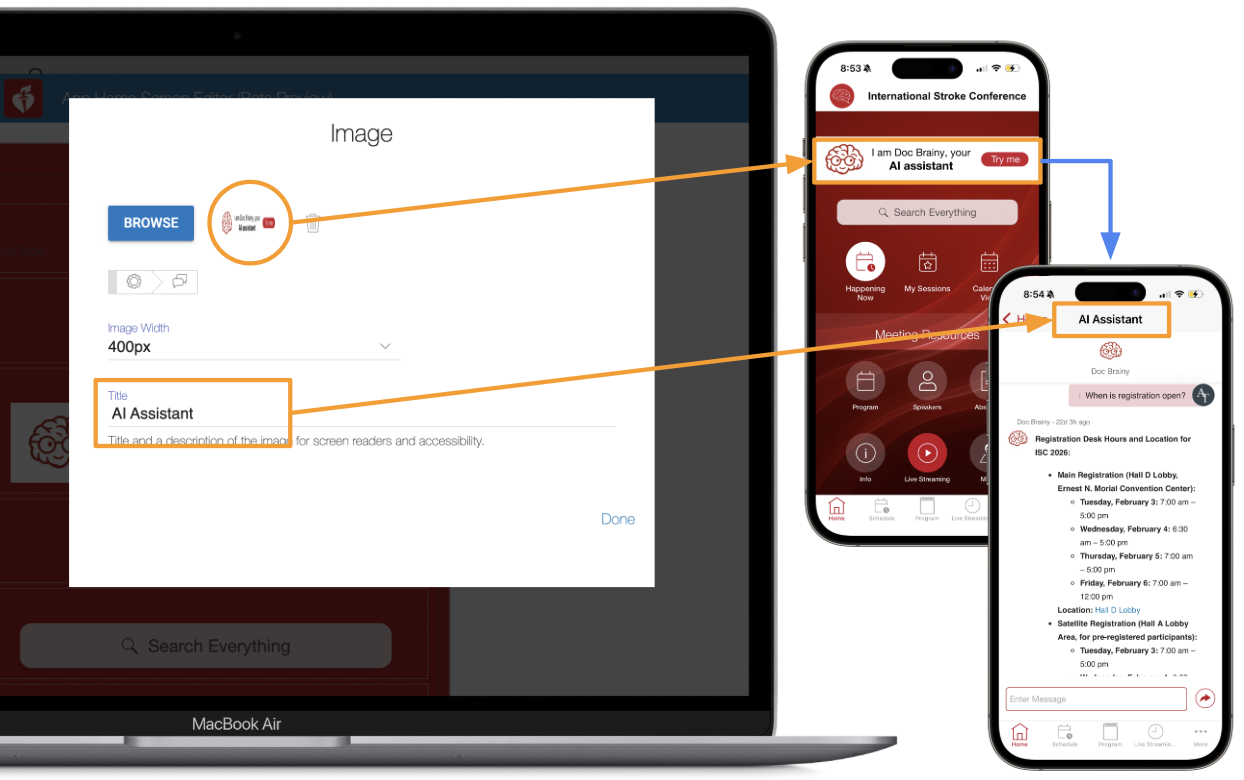 The example screenshot below shows editing the image object for an AI Assistant banner on the Home Screen. The image title is AI Assistant. While this image title is not visible on the Home Screen, it appears on top of the page that opens once the user taps or clicks on the image.