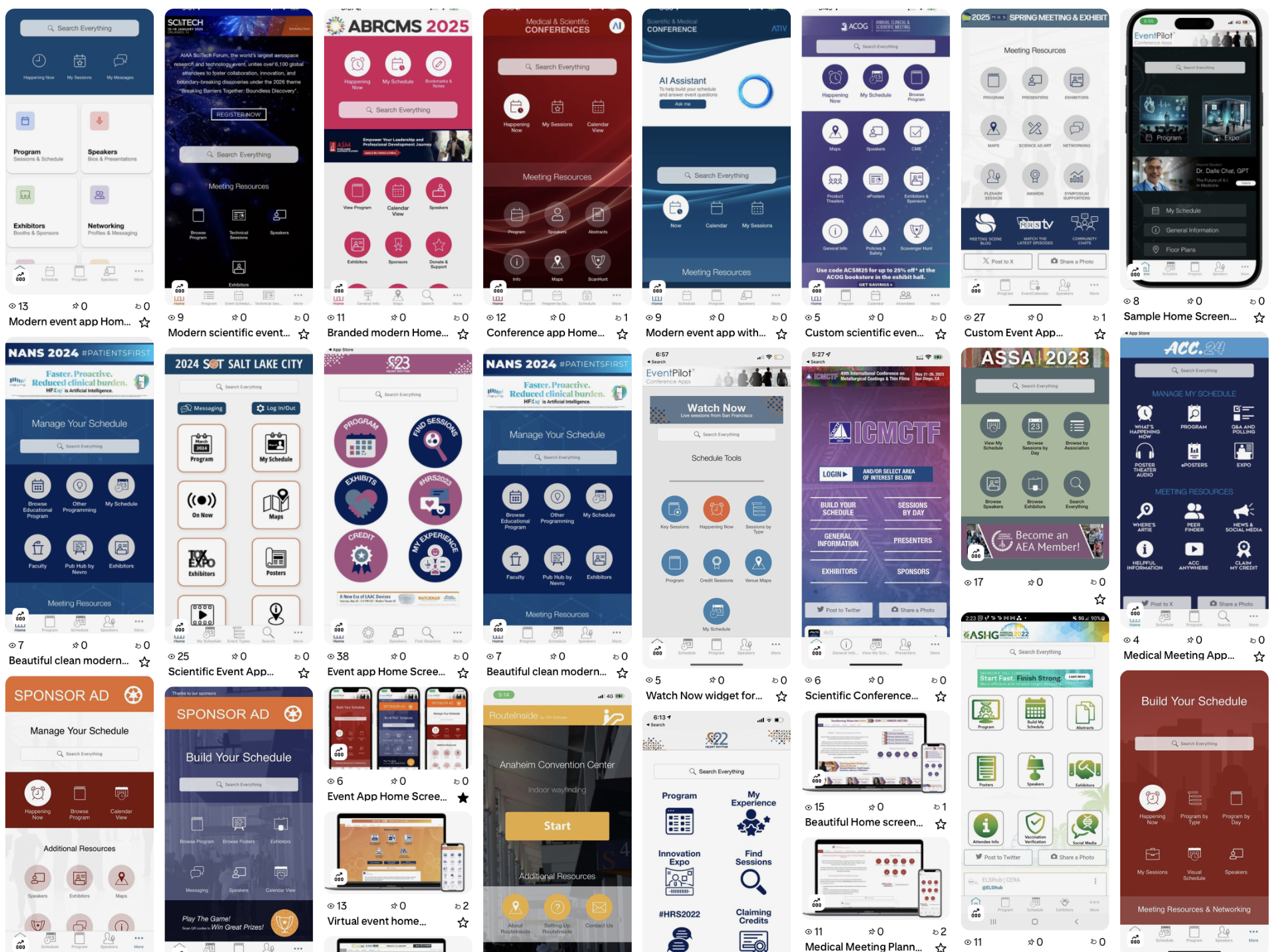For event apps, ideally keep your main buttons to 6 plus the global search and rotating ad banners. Instead of displaying all ways your offer your attendees to navigate your program on a single page, create landing pages. For example, if you offer a wide variety of member resources, instead of adding all links on your home page: